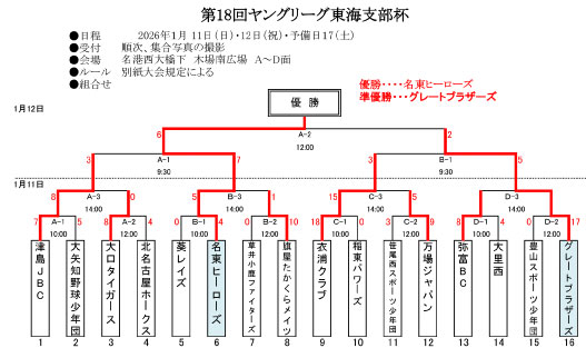 2025年1月 12日(日)・13日(祝) 予備日18(土)で名港西大橋下・木場南広場にて第17回ヤングリーグ東海支部杯が開催されました。 今回はAチーム・Bチームのエントリで行われました。
