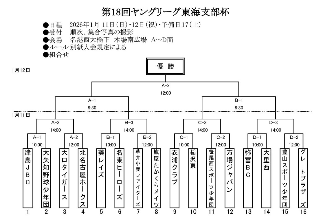 2025年1月 12日(日)・13日(祝) 予備日18(土)で名港西大橋下・木場南広場にて第17回ヤングリーグ東海支部杯が開催されました。 今回はAチーム・Bチームのエントリで行われました。